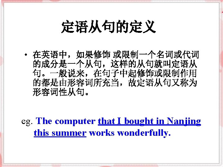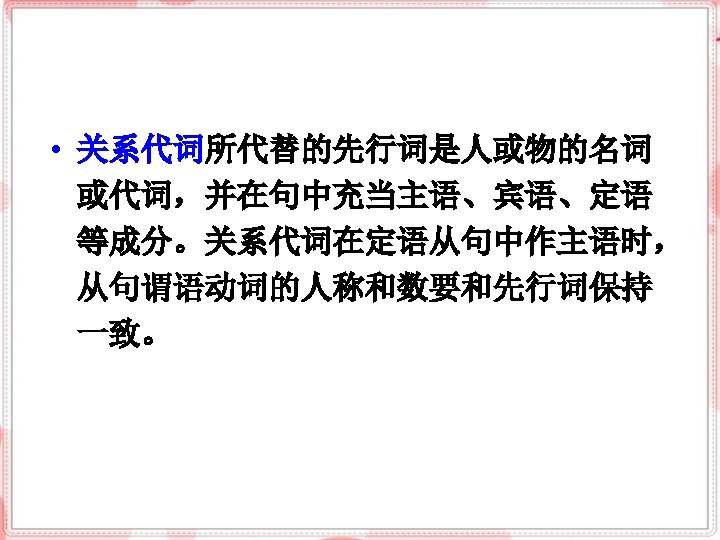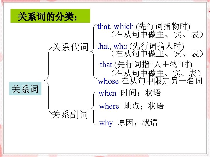 相关概念 • 先行词:定语从句所修饰的名词或代词(组)。 • 关系词:连接定语从句和主句并在定语中起作用 的词。 He is the man whom / that I saw yesterday. Please pass me the book whose cover is green. The package which / that you are carrying is about to come unwrapped. Beijing is the place where I was born.