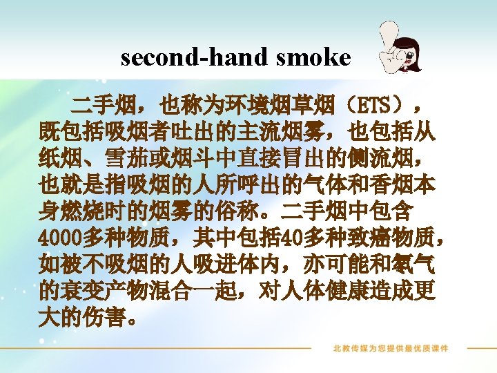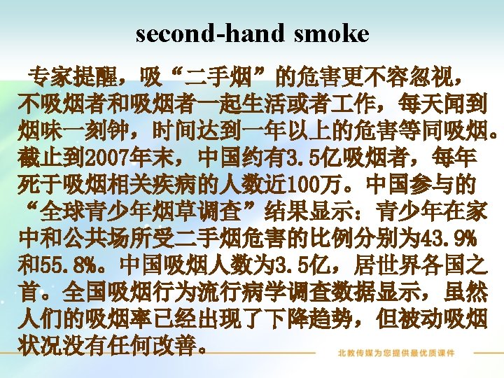 Words and Expressions smoke harmful disease lung harm breathe public law v. 吸烟 n. 烟 adj. 有害的;� 致� 害的 n. 病;疾病 n. 肺 v. & n. � 害;� 害 v. 呼吸 adj. 公共的;大众的 n. 法律