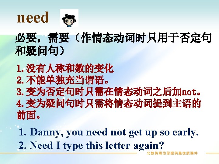 need用在疑问句中,肯定回答一般用must ,否定回答一般用need not。 1. — Need we eat foods from each food group? — Yes, you must. 2. — Need the guests leave the place right away? — No, they needn’t.