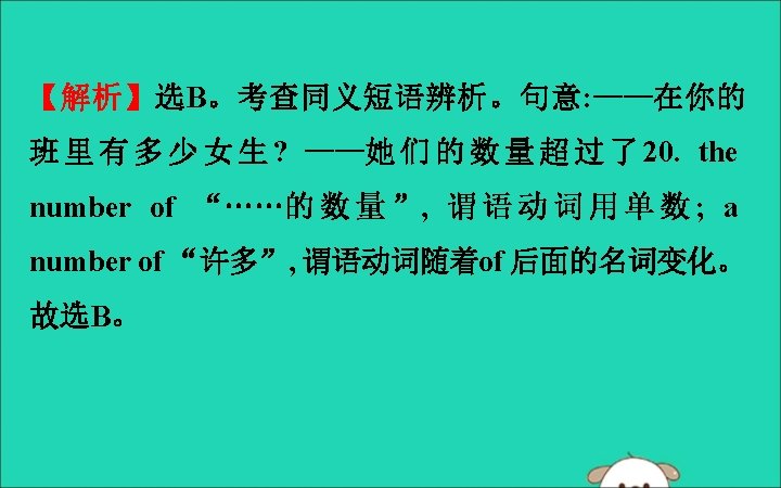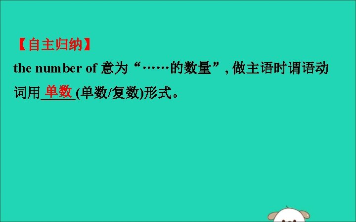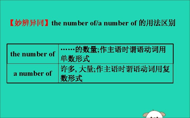 *A number of students are running on the playground. 许多学生正在操场上跑步。 *The number of the teachers in our school is 100. 我们学校老师的数量是 100.
