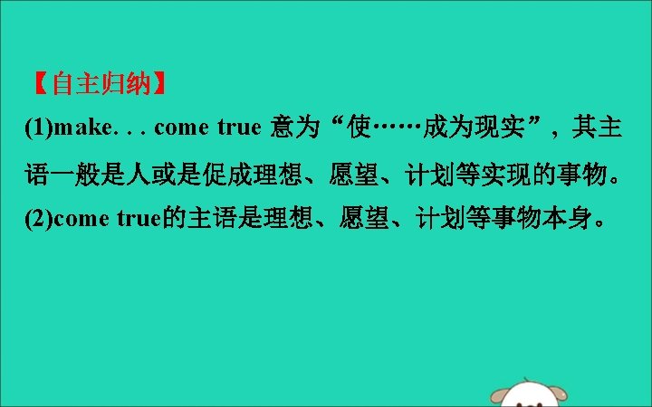 考点 2 make. . . come true 使……成为现实 *How can a person make his or her birthday wish come true? 人们如何使生日愿望成为现实呢? *If you work hard, you can make your dream come true. 如果你努力学习, 你就能实现你的愿望。