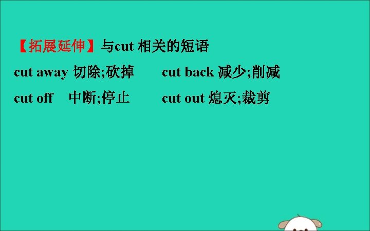 ②你能帮助我把这些肉切碎吗? cut up Can you help me ___the meat ___. ③你最好切断水源。 cut ___ off the water supply. You’d better____