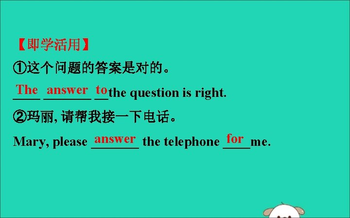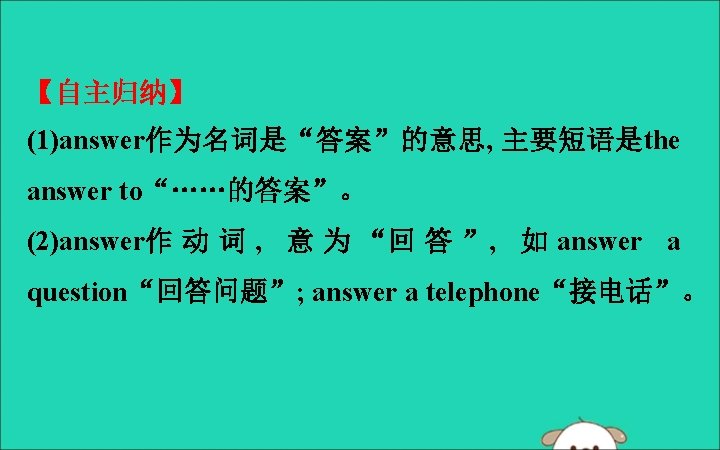 考点 2 answer n. &v. 答案; 回答 *The answer would be different in different countries. 在不同的国家会有不同的答案。(教材·P 59) *The answer to the third question is B. 第三个问题的答案是B。 *Please ask and answer in pairs. 请两人一组进行问答。