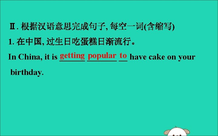 4. 如果他或她一口气把蜡烛全吹灭的话, 许的愿望便会 成真。 in ____ one ___, go the If he or she blows out all the candles __ come ____. true wish will _____ 5. 它们给过生日的人带来好运。 bring _____ good ____ luck __ to the birthday person. They _____