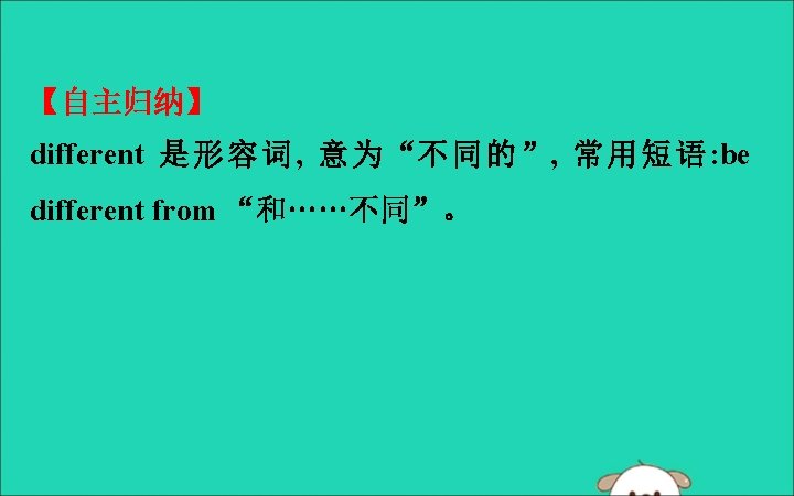 【即学活用】 ①北京的天气与济南的天气不同。 is ____ different _____ from that in Jinan. The weather in Beijing __ ②他们之间有许多不同之处。 differences between them. There are many _____ ③(2016·恩施中考)他看上去与我想象的不一样。 different _____what from He looked ____ I’d expected.