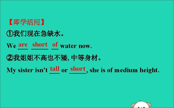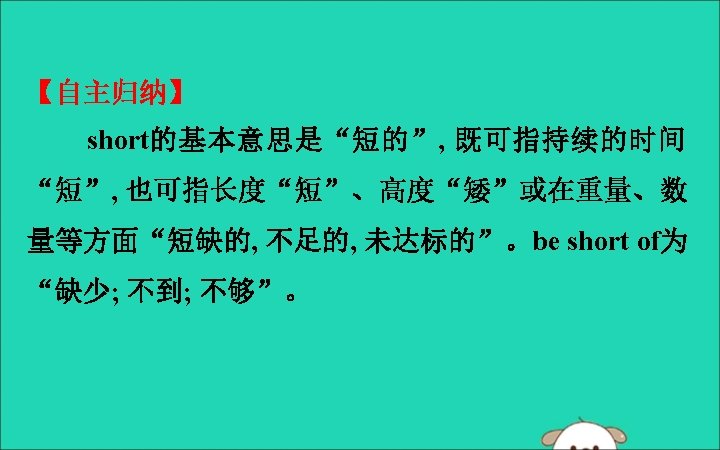 考点 4 short adj. 短的; 矮的; 短缺的 *I know. But we are short of fish. 我知道。但是我们缺鱼。(教材·P 60) *—What does your sister look like? 你姐姐长什么样? —She is short. 她很矮。