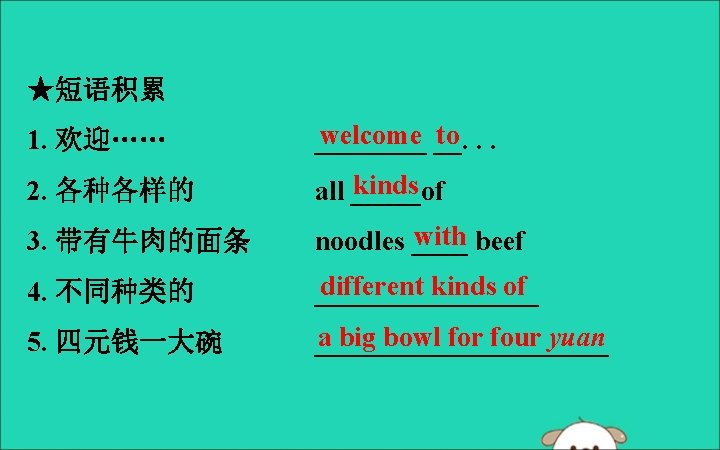 3. 我们有各种各样的面条。 We have different kinds of noodles. ________________ 4. 我们有蔬菜面条, 仅售 6元。 We have vegetable noodles for only 6 yuan. ___________________