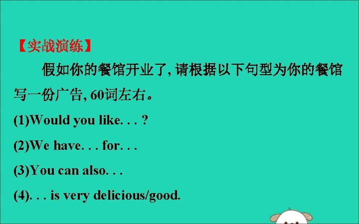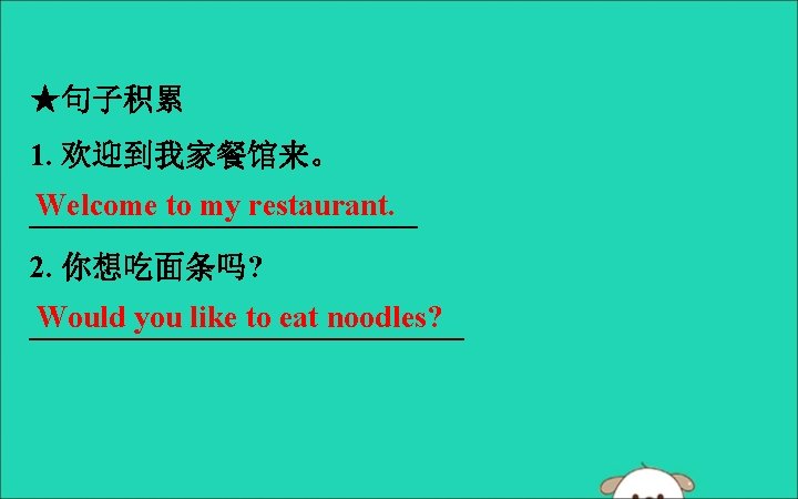 5. 我们的水饺也非常可口。 Our dumplings are very delicious, too. _________________ 6. 我希望在我的餐馆快点见到你! I hope to see you at my restaurant soon! __________________