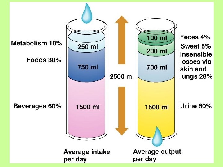 Maintaining Water Balance • Water intake must equal water output (about 2500 m. L / 2. 5 L every day) • Sources for water intake – Ingested foods and fluids – Water produced from metabolic processes • Sources for water output – – Vaporization out of the lungs Lost in perspiration Leaves the body in the feces Urine production