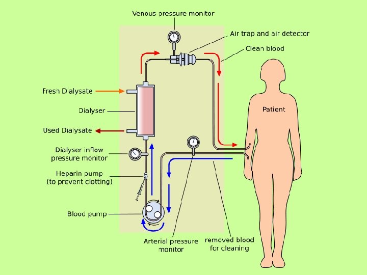 Dialysis • Provides an artificial replacement for lost kidney function for people with renal failure • Utilizes the principles of diffusion, where substances in water tend to move from areas of higher concentration to lower concentrations • Blood flows by one side of a semi-permeable membrane, and a special fluid flows by the opposite side • Small solutes (such as ions and nitrogen wastes) are removed, but larger solutes (such as RBC’s and large proteins) remain in the blood