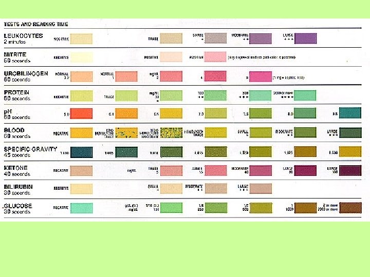 Urinalysis • Dipsticks are thin strips of plastic that change color in the presence of specific substances… can be used to measure… • Specific gravity (density) • Acidity of the urine (p. H) • The presence of blood, proteins, or sugars • Substances produced during the breakdown of fatty acids (ketones)