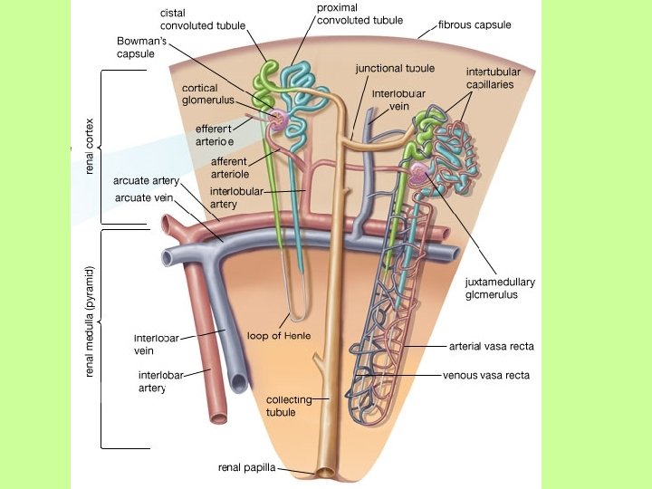 Blood Flow of Kidney • Blood comes in via the Renal Artery • Branches down into afferent arteriole, which feeds the glomerulus with blood