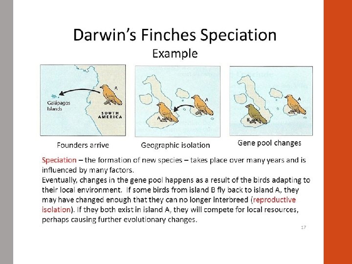 Example: Darwin’s Finches • Founders Arrive: finches from South America settle on one of the Galapagos Islands and reproduce. • Geographic Isolation: the new environment was different so natural selection enabled a new species to form. A small sample of this new species moved to inhabit other islands. Because flying over the open water is rare, the finches no longer shared a common gene pool. • Changes in Gene Pools: the differing environment on each island caused natural selection to occurchanging a heritable trait and creating a distinct population characterized by the new phenotype.