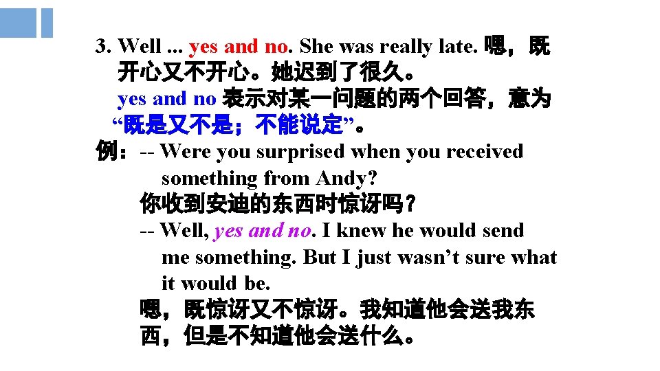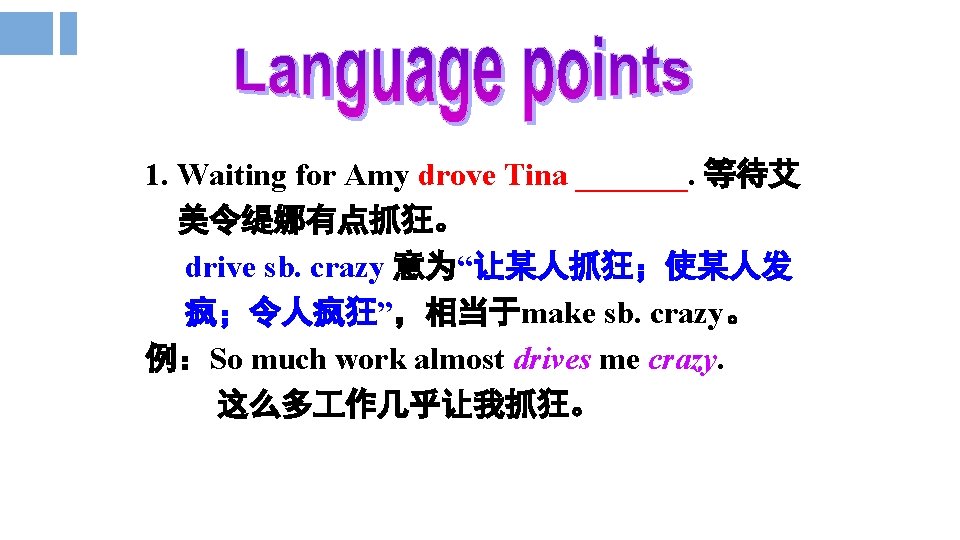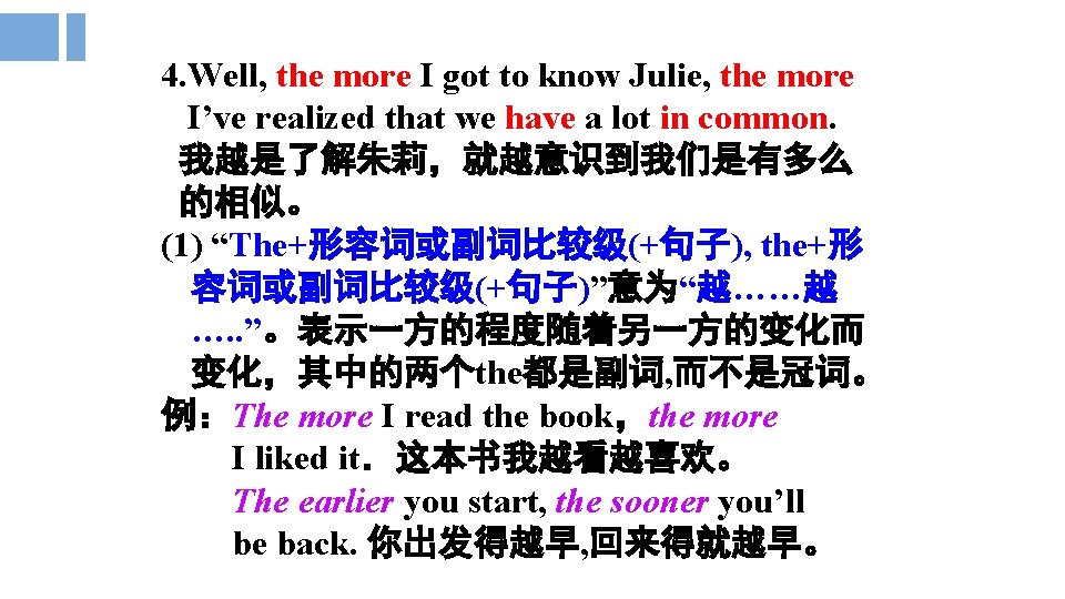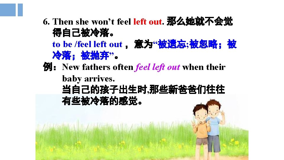 5. Mmm. . . why don’t you ask Alice to join you each time you do something with Julie? 嗯……每次你和朱莉在一起的时候,你何不 邀请爱丽丝加入呢? each time 名词词组, 充当连词引导时间状语从 句, 意为“每一次……”, 类似的词组还有every time, next time, last time, the first time等。 例:You should take off your shoes first each time you enter the room. 每次你进入房间就应该先脱鞋。