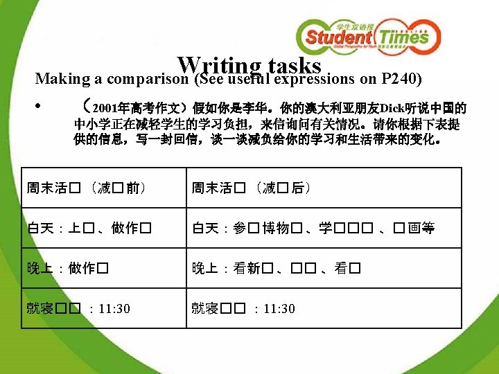 教材整合思路 • Reading tasks • Listening tasks • Writing tasks