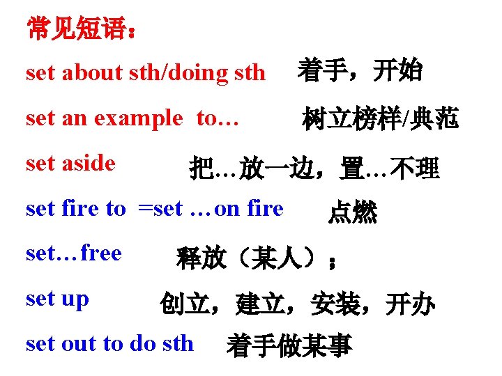 6. They set out to find the monster. set out (to do sth/for sw)出发;开始 他们在拂晓时出发了。 They set out at dawn. 我们动身的日子快要到了。 The day was drawing close for us to set out.