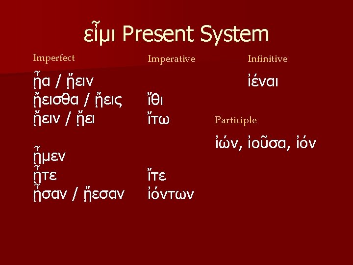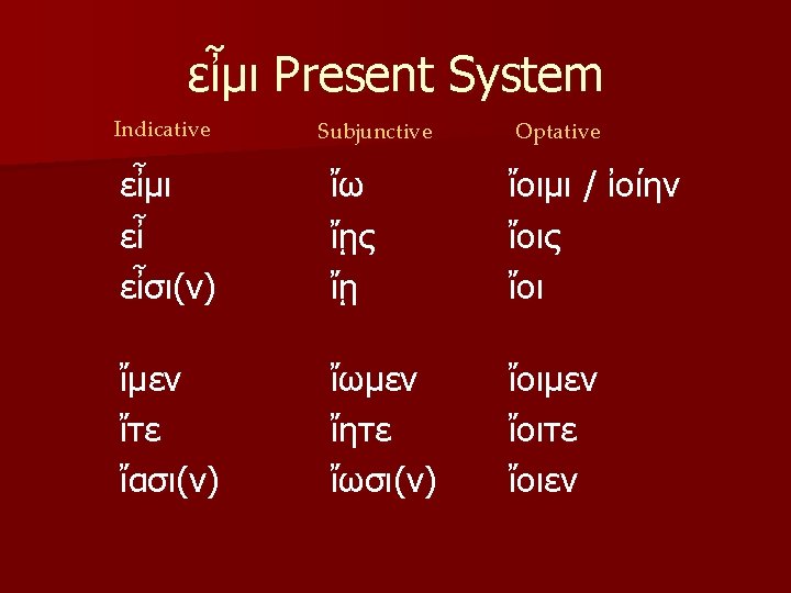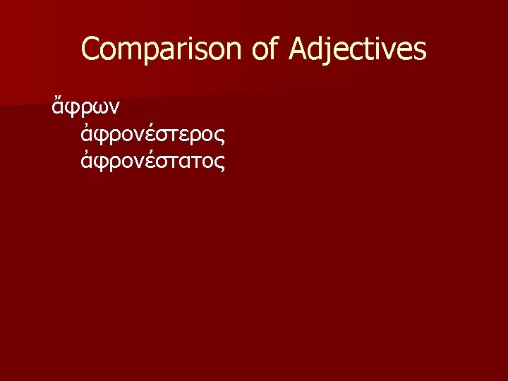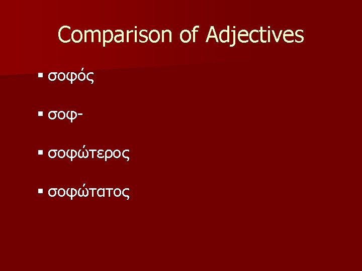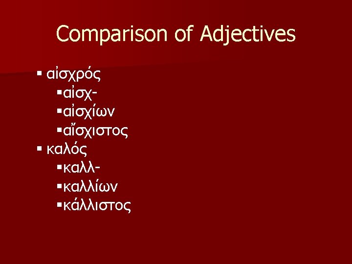 Comparison of Adjectives §-ιων, ιον §-ιστος, ιστη, ιστον § Adjectives which take these endings must be learned individually. § The stems are made differently for each adjective.