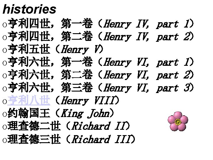 Tragedies o罗密欧与朱丽叶 (Romeo and Juliet) o麦克白(Macbeth) o李尔王(King Lear) o哈姆雷特(Hamlet) o奥赛罗(Othello) o考利欧雷诺斯(Coriolanus) o脱爱勒斯与克来西达 (Troilus and Cressida) 雅典的泰蒙(Timon of Athens) 诗