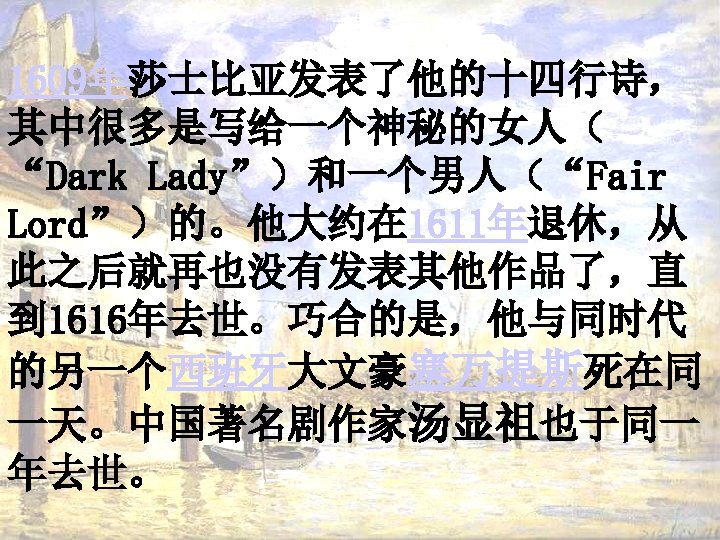 poetry 十四行诗(The Sonnets) o爱人的怨诉(A Lover's Complaint) o鲁克丽丝失贞记(The Rape of Lucrece) o维纳斯和阿多尼斯(Venus and Adonis) o热情的朝圣者(The Passionate Pilgrim o凤凰和斑鸠(The Phoenix and the Turtle)