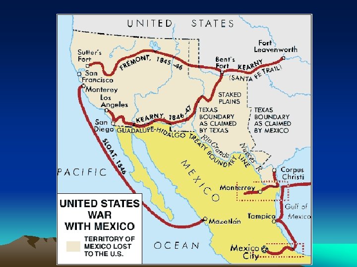 On The World Stag • War or 1812 • 1823 The Monroe Doctrine - warned Europe not to intervene with new Latin American Nations • 1830’s Texas succeeded from Mexico – became a state in 1845 – U. S. goes to war with Mexico and wins, adds more territory to the nation, including california.