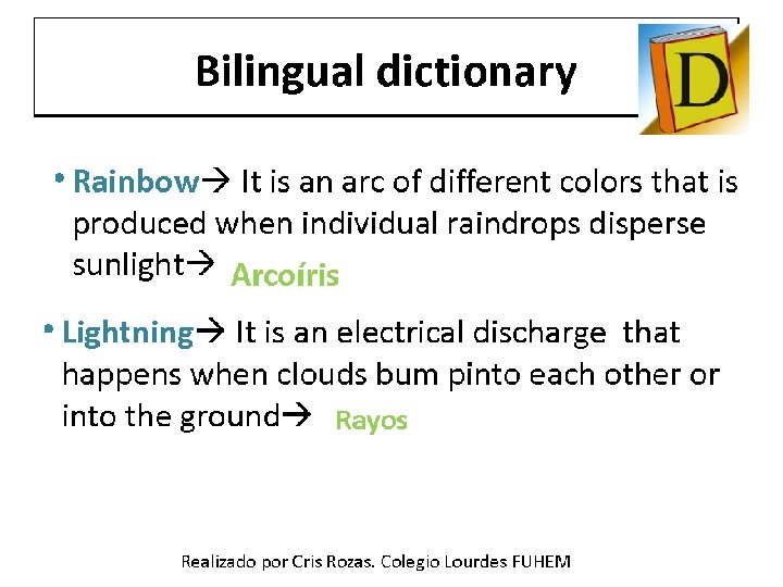 Bilingual dictionary • Geosphere It is the solid part of the planet Geosfera • Hydrosphere It consists of all the water on Earth Hidrosfera Realizado por Cris Rozas. Colegio Lourdes FUHEM