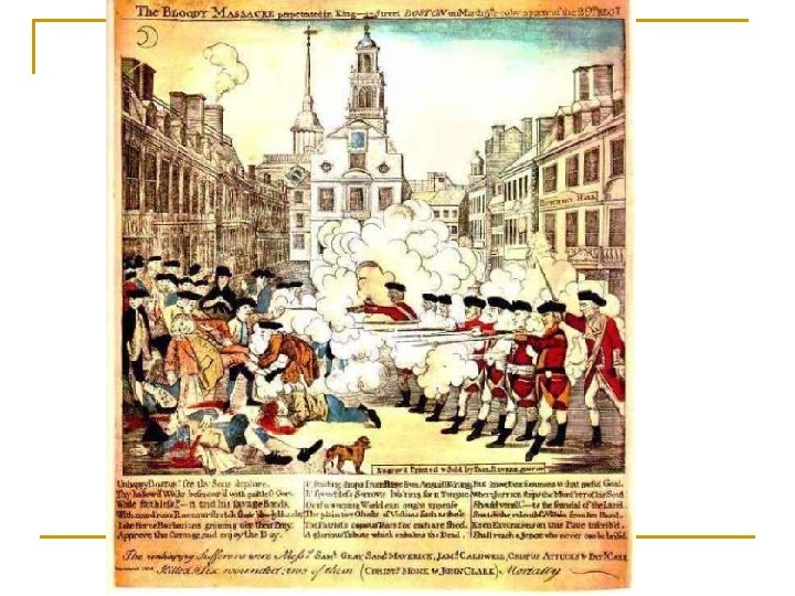 Boston Massacre Continued n n Colonial leaders used the killings as propaganda (information made to influence public opinion). Samuel Adams put up posters calling the incident the Boston Massacre. n n n Paul Revere made an engraving showing the British troops firing on an orderly crowd. This led colonists to call for stronger boycotts of British goods. Eventually Townshend Acts repealed except Tea.