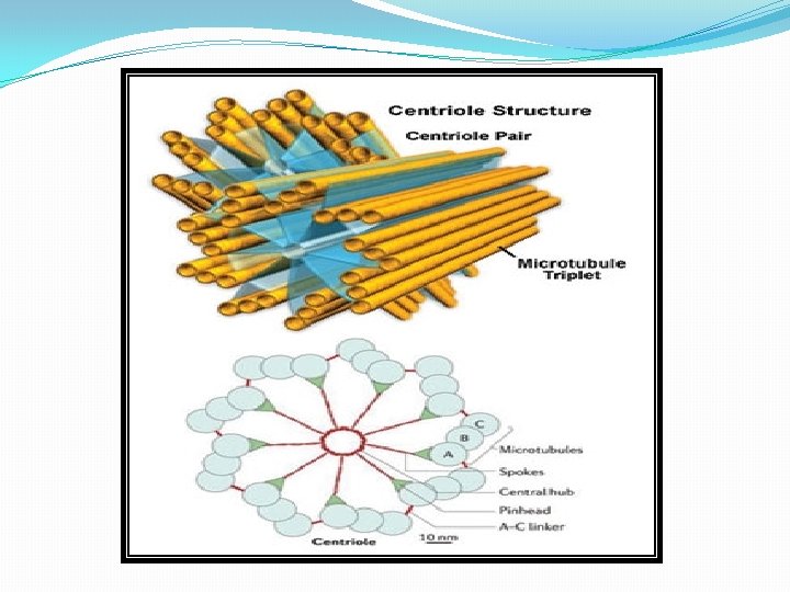 Structure of Centrioles �Centrioles and basal bodies are cylindrical structures which are 0. 15– 0. 25 um in diameter usually 0. 3– 0. 7 um in length, though, some are as short as 0. 16 um and others are as long as 8 um. �They are visible under a light microscope, but the details of the centriole structure were revealed only under an electron microscope. �Each cell has a pair of centrioles in the centrosome, a region near the nucleus. The members of each pair of centrioles are at right angles to one another. �They are minute-sub-microscopic microtubular sub cylinders with a configuration of nine triplet fibrils and the ability to form their own duplicates, astral poles and basal bodies, without having DNA and a membranous covering.