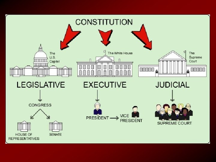 Separation of Powers Distributes power equally among three branches of government Ensures no person or branch of government is too powerful
