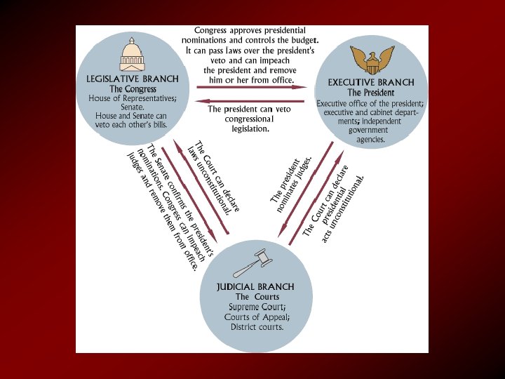 Checks and Balances • * Each branch has powers that no other branch can have • * Each branch has powers that limit the powers of the other two branches • * Ensures that no branch becomes too powerful