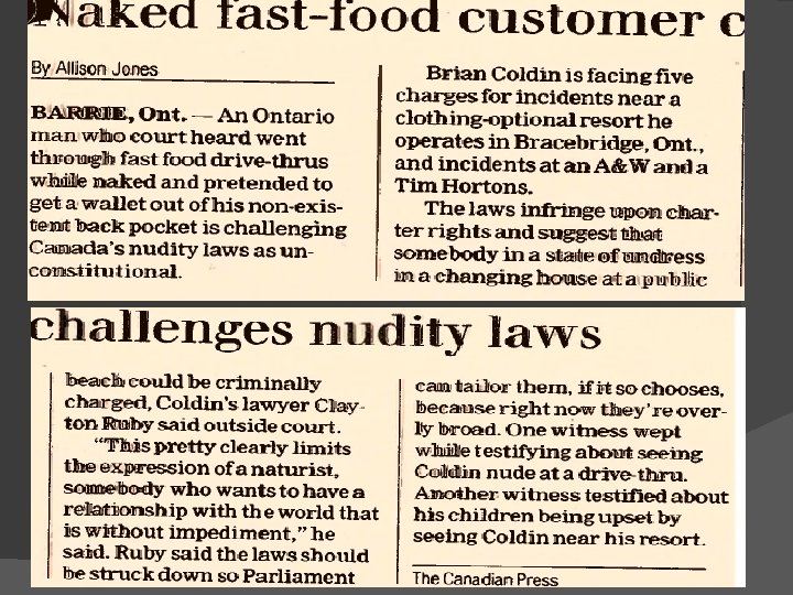 Newspaper article- Naked Man � Is the man’s freedom of expression being violated? � What kind of impact would there be in society if the courts decide to strike down nudity laws? � How do the courts balance the individual’s rights with society’s rights?