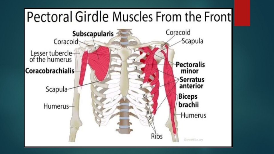 FUNCTIONS OF PECTORAL GIRDLE q Pectoral girdles are responsible for providing structural support to your shoulder region on the left and right side of your body. q They also allow for a large range of motion. q Connecting muscles necessary for shoulder and arm movement.