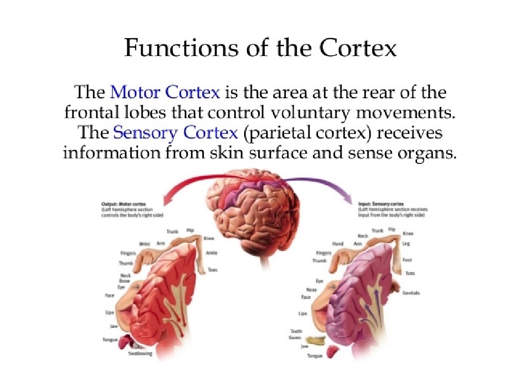 Cerebral Cortex – thin surface layer of interconnected neural cells; thinking crown; ultimate control center *compared to bark on a tree - our ability to think and adapt, and not operate on rigid genetic instructions, is a result of the larger cortex mammals have Structure of the Cortex- contain around 20 to 23 billion nerve cells and 300 trillion synaptic connections. Glial Cells - glue cells, or worker bees, that feed and sheath these cells play a role in learning and thinking by “chatting” with neurons they participate in information transmission and memory