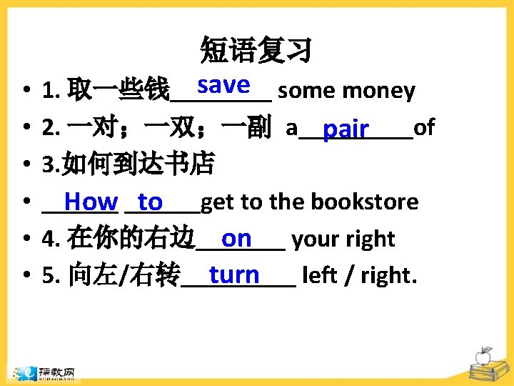 • • 21. 兑换一些钱____ exchange some money 22. 去…的路the_______. . . way to 23. 盼望;期待(做)某事. look____ to sth(doing) sth forward 24. 初次,第一次_______the____time for first 25. 在三楼_______the____floor on third 26. 由于(做)某事感谢某人 _______sb____(doing) sth Thank for