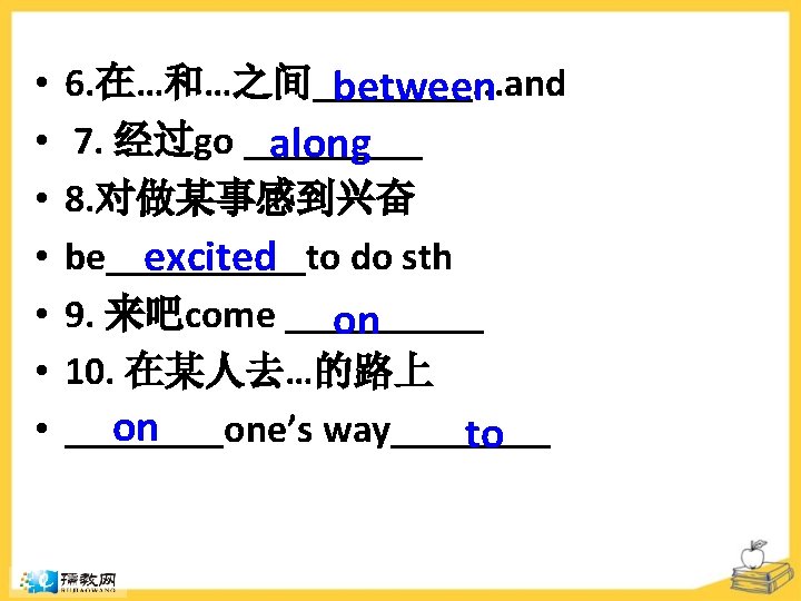 完成句子: • 1. 沿着这条路直走,然后左转。 • Go along/down this street and _________. turn left • 2. 我路过那家商店的时候停了下来。 went past • I stopped when I ______ the store. • 3. 昨天吉姆直到下午3点才回来。 didn’t come until three • Jim ______ back ______ o'clock in the afternoon yesterday.
