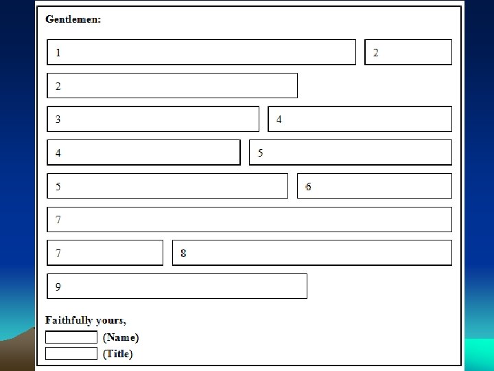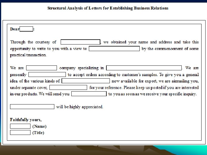 • Since business connections are of vital importance to firms engaged, dealers must not only complete what they can to consolidate their established relations with firms having previously engaged but also strive unswervingly and continuously to develop and revitalize or rejuvenate their trading relations by seeking new engagements. • The following statements might offer you a panoramic view together with an all-round perspective and thus facilitate your understanding and writing of structural parts of letters for establishing business relations: