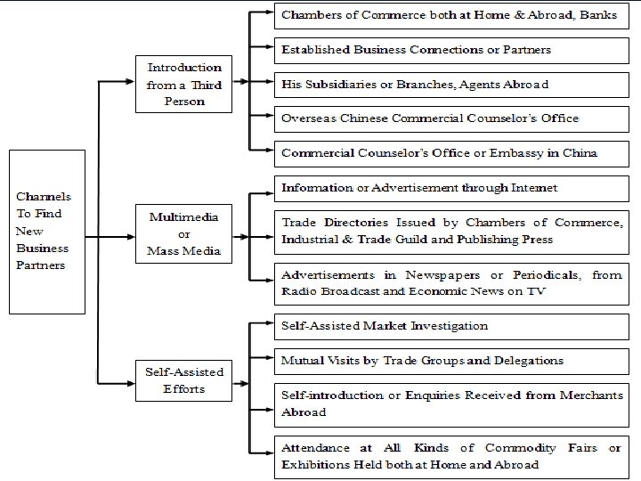 • But how could a dealer or businessman secure all necessary information about a brand-new market or prospective business partners? • Usually a dealer or businessman may approach its new business counterparts abroad or obtain necessary information through any of the following three channels, i. e. , ‘Introduction from a Third Person’, ‘Multimedia or Mass Media’ and ‘Self-Assisted Efforts’, for detailed information see the following table: