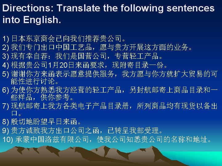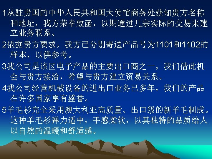 Directions: Translate the following sentences into Chinese. 1) Having had your name and address from the Commercial Counselor’s Office of the Embassy of the People’s Republic of China in your country, we now avail ourselves of this opportunity to write to you and see if we can establish business relations by the commencement of some practical transactions. 2) As requested, we are airmailing to you, under separate cover, a sample of Art. No 1101 and No 1102 for your reference. 3) We are one of the leading exporters dealing with electronic products in the area and take this opportunity to approach you in the hope of establishing business relations. 4) We have been engaged in handling importation and exportation of machinery and equipment for many years. Our products enjoy great popularity in many countries. 5) Our wool sweaters are exclusively made from quality exportgrade Australian pure new wool, which has unique features giving natural warmth and comfort with proper elasticity and soft feeling.