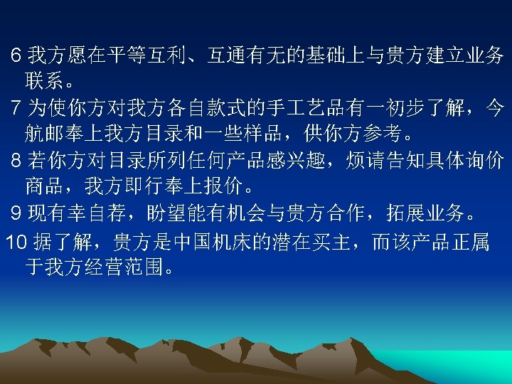 6) We are willing to enter into business relations with your firm on the basis of equality, mutual benefit and exchanging what one has for what one needs. 7) In order to give you some idea of various qualities of handicrafts we carry, we have pleasure in forwarding you by airmail one catalog and a few sample books for your perusal. 8) If any of the items listed in the catalogue meets your interest, please let us have your specific enquiry, and our quotation will be forwarded without delay. 9) We have the pleasure to introduce ourselves to you with the hope that we may have an opportunity of cooperating with you in your business extension. 10) We are given to understand that you are potential buyers of Chinese machine tools, which comes within the frame of our business activities.