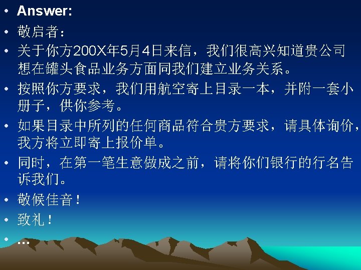 • Answer: • Dear Sir or Madam: • Sub: Establishment of Business Relations with You • Through the courtesy of the Commercial Counselor’s Office of the Embassy of the People’s Republic of China in your country, we come to know your name and address and learned that you are in the market for importing Chinese textiles. We now avail ourselves of this opportunity to write to you and see if we can enter into business relations with you by the commencement of some practical transactions. • We are exporters dealing mainly in silk products processed in Suzhou, China, with high quality and reasonable prices. We are also airmailing you, under separate cover, a catalogue, and our latest pricelist together with some samples for your reference / study. • For any information concerning our credit standing, please refer to the following bank: • The Bank of China, Shiyan Branch. • If any of the items listed in the catalogue meets your interest, please let us have your specific enquiry, and our quotation will be forwarded without delay. • We await your prompt reply. • Sincerely yours, • ……