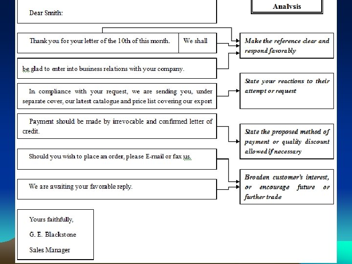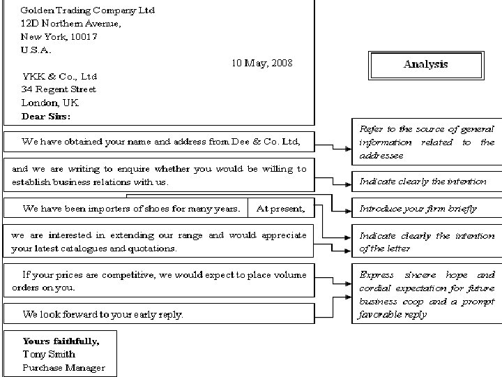 • Upon the above analysis, we may come to the impression and conclusion that: • Structural parts of letters for establishing business relations consist of the following four sections: • Section 1: Refer to the source of general information related to the addressee (such as name and address); • Section 2: Indicate clearly the intention of the letter; • Section 3: Introduce your firm briefly, such as the business scope, branches or liaison offices if any, financial standing and credit rating, etc. • Section 4: Express sincere hope and cordial expectation for future business cooperation and a prompt • favorable reply. • Sometimes the terms of sales or purchases are mentioned with catalogues, price lists and other details enclosed for reference.