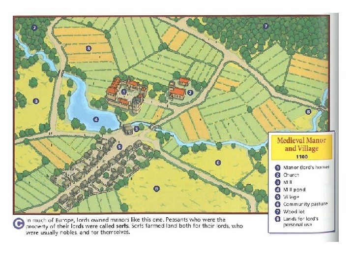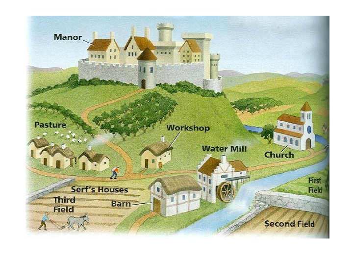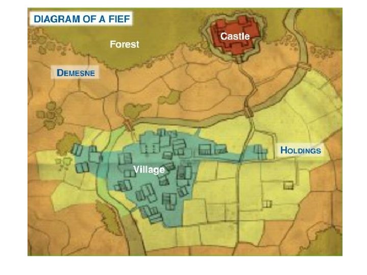 2. THE FIEF. Rural society based on agriculture. People lived in farms and villages. Land was divided into great estates or fiefs. FIEF (or manor) was a large area belonging to the king, nobles or the Church. § Divided into 2 parts: demesne and holdings. § §