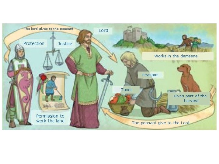 B. Lord-peasant relationship. Ø Lords of the fief: § § received the land, charged taxes, were in charge of justice, offered protection to the peasants. Ø Peasants: § § worked for the noble in the demesne, paid taxes, received protection, had permission to work the land
