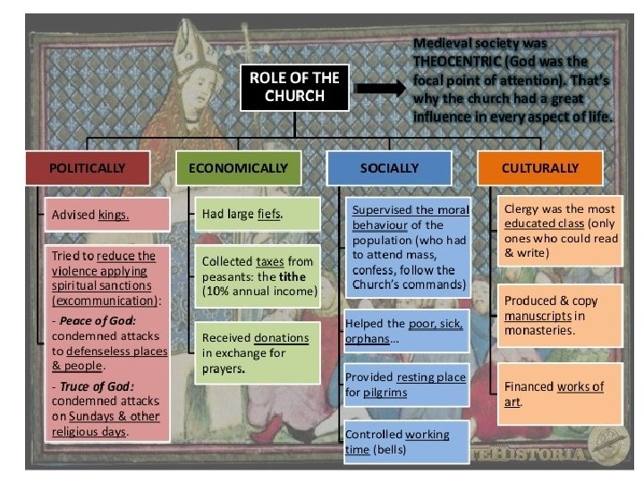 a. Politics. b. Economy. § Church intervened in political affairs. § Royal Council. § Peace of God: protection for clergymen, peasants, merchants → excommunication. § Truce of God: truce in battles on Sundays and religious holy days. § major landowner→ fiefs. § collected taxes. § tithe. § donations: money and lands.