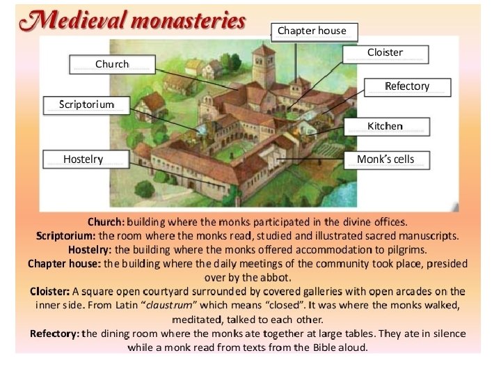 2) Daily life. a. Secular clergy: § Priests and their bishops. § They lived among the population. b. Regular clergy: § Monks and abbots. Nuns and abbesses. § They lived in monasteries. Communal life. § Monastery → self-sufficient. § Different orders: Benedictines, Cistercians, . . . § They took the vows of the order: poverty, chastity, obedience, . . . § “ora et labora”.