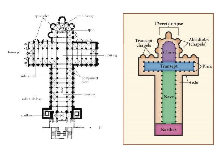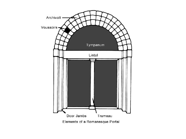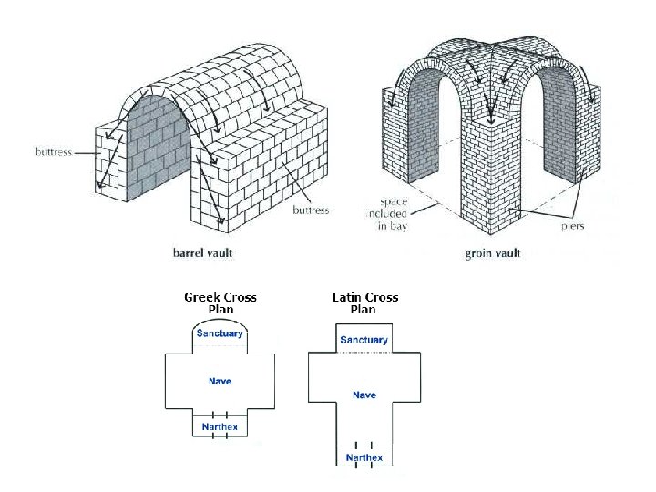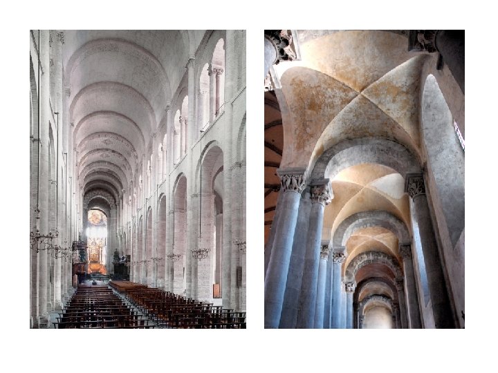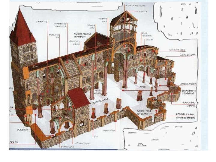 2) Romanesque architecture. first impression → solidity and strength. thick walls of stone. few windows and dark interior. arch: semicircular. roofs: barrel vaults or groin vaults. weight supported by piers, columns and buttresses. plan: Latin cross with lateral aisles. o two naves that cross in the transept. o apse at the eastern end. § pilgrimage routes: ambulatory behind the altar. § towers. § § § §