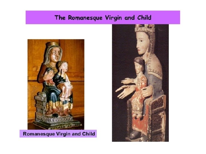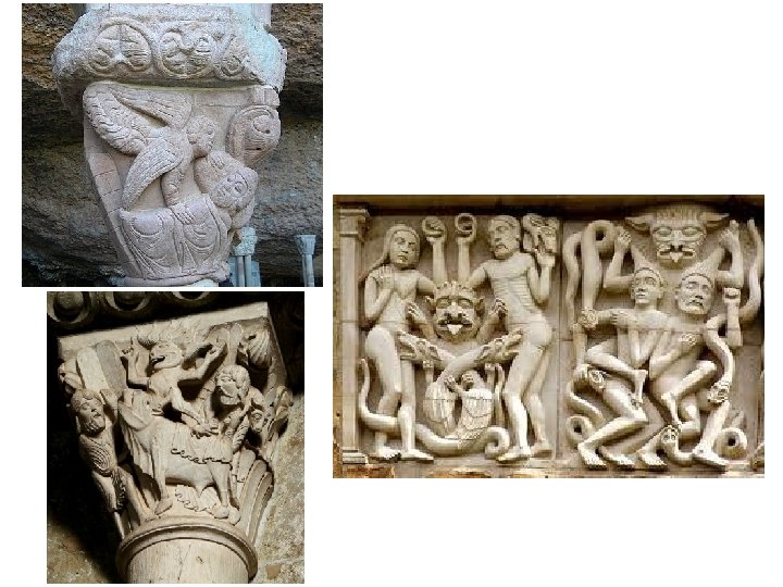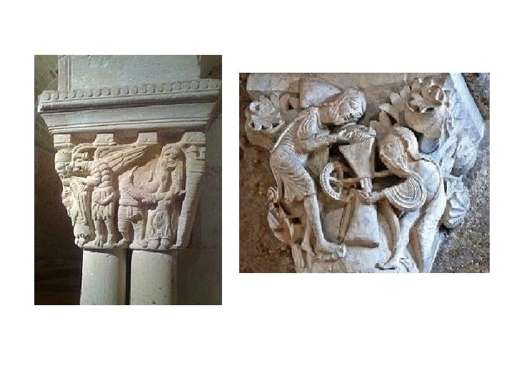 3) Sculpture. § Purpose: to teach people (illiterates) principles of Christian religion. § Religious themes. § Stone sculptures: facades, portals and capitals. § Painted wood sculptures: decoration inside. § Figures → not natural → rigid/no movement. § Not realistic → symbolic.
