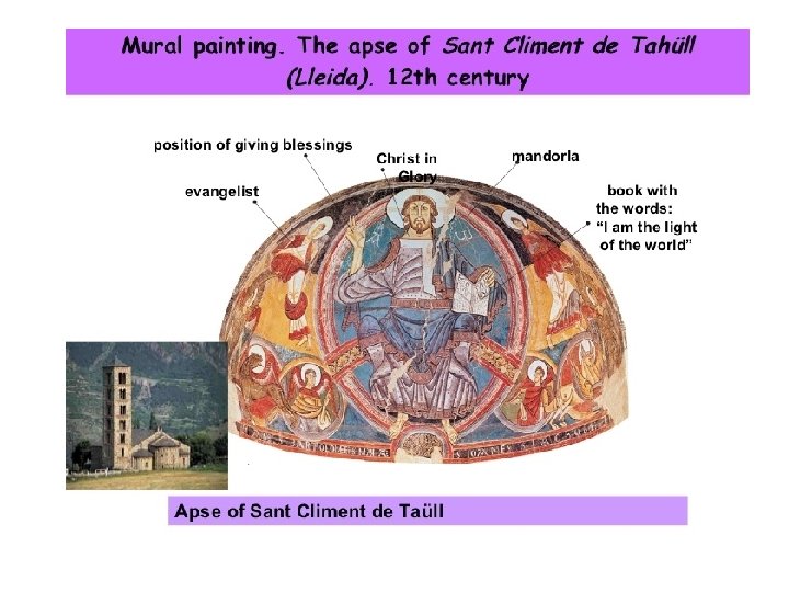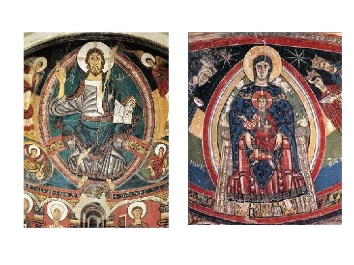 4) Painting. § Most of the remains are on the walls and vaults of the apses. § Figures in two dimensions (flat) and little detail in the background. § Plain and bright colours. § No movement or expression. § Miniatures and manuscripts were decorated with pictures.