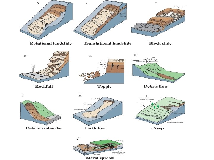 Slides and Slumps • A slide is a sheet of material that slips over a failure plane ending anywhere from a meter to a kilometer down slope. • A slump is a landslide where the underlying rock masses tilt back as they slide from a cliff or escarpment. Slumps are sometimes caused by clear cutting on unstable soils. • Slumps produce concave scars while slides tend to produce a scarp or cliff exposure. Trees are broken and bent and the slide can bury the soil down slope.