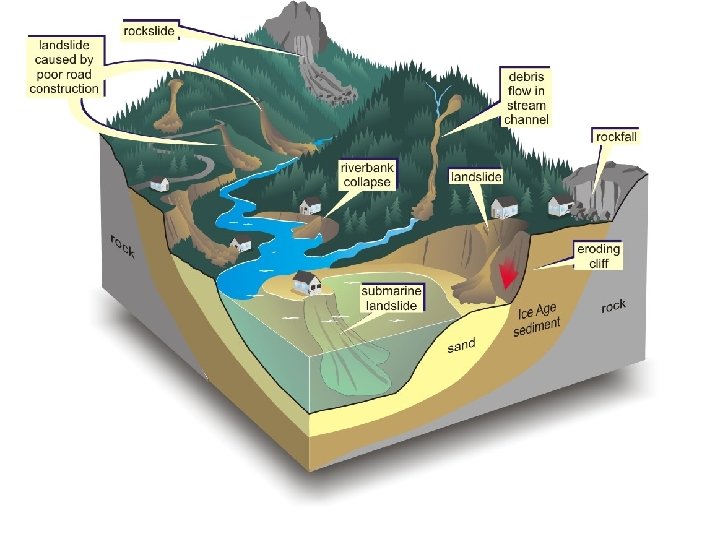 Mass Wasting • Mass movement is the down slope movement of earth materials under the influence of gravity. • The detachment and movement of earth materials occurs if the stress imposed is greater than the strength of the material to hold it in place.