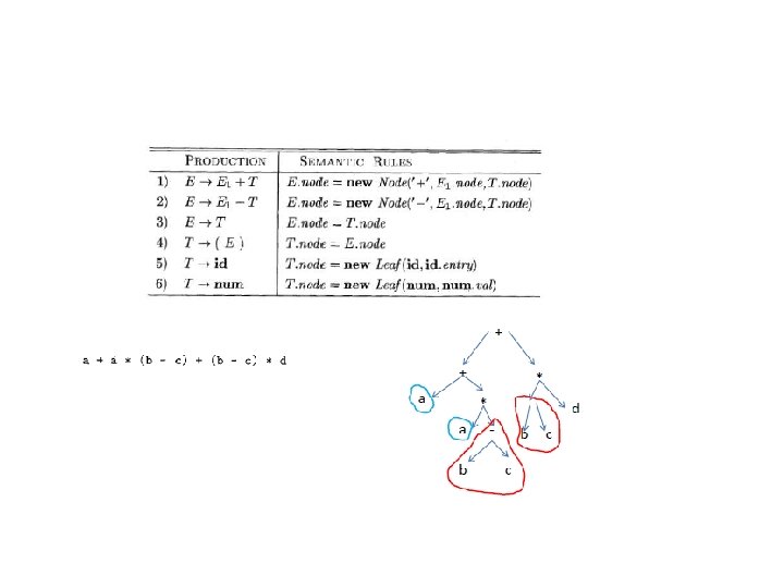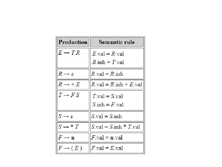 Inherited attributes with recursive descent • Inherited attributes in an L-attributed set of equations are easy to handle by recursive descent. • A synthesized attribute is a value returned by a syntactic function. • An inherited attribute is a parameter that is passed to a syntactic function. • That explains why the functions in the recursivedescent example are written the way they are.